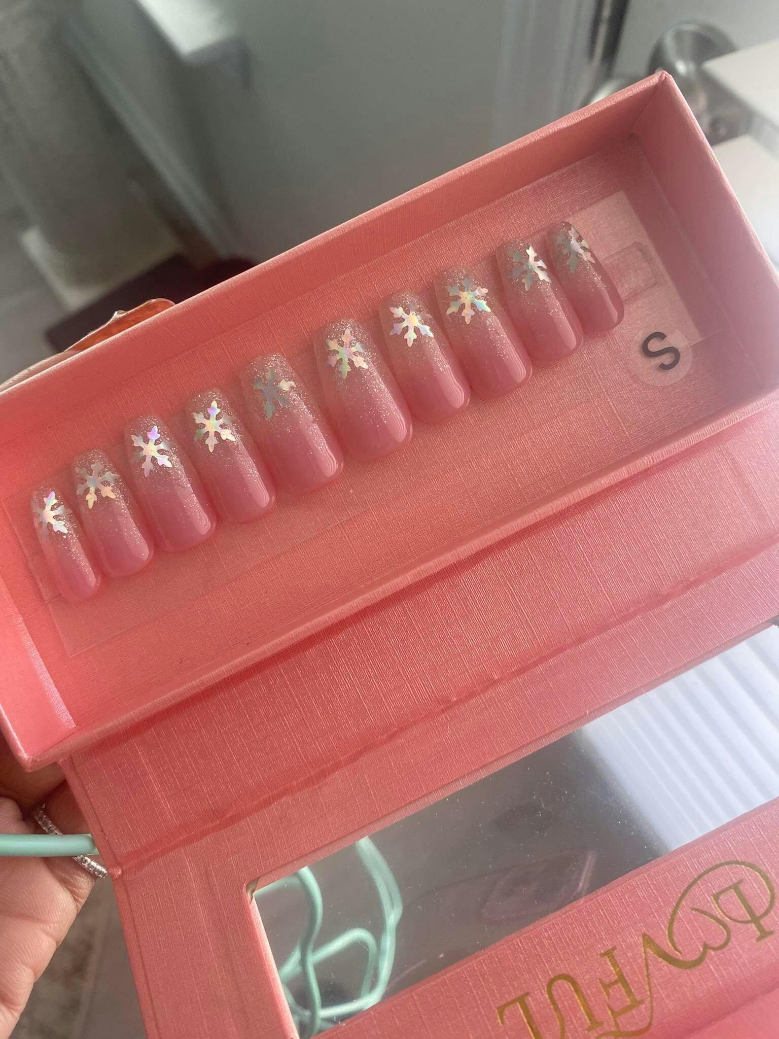 Soft pink, iridescent sparkles, and dancing snowflakes - just like the northern lights on your fingertips. This design captures the quiet glow of winter with holographic flakes that shimmer in every light. Elegant, dreamy, and effortlessly magical.