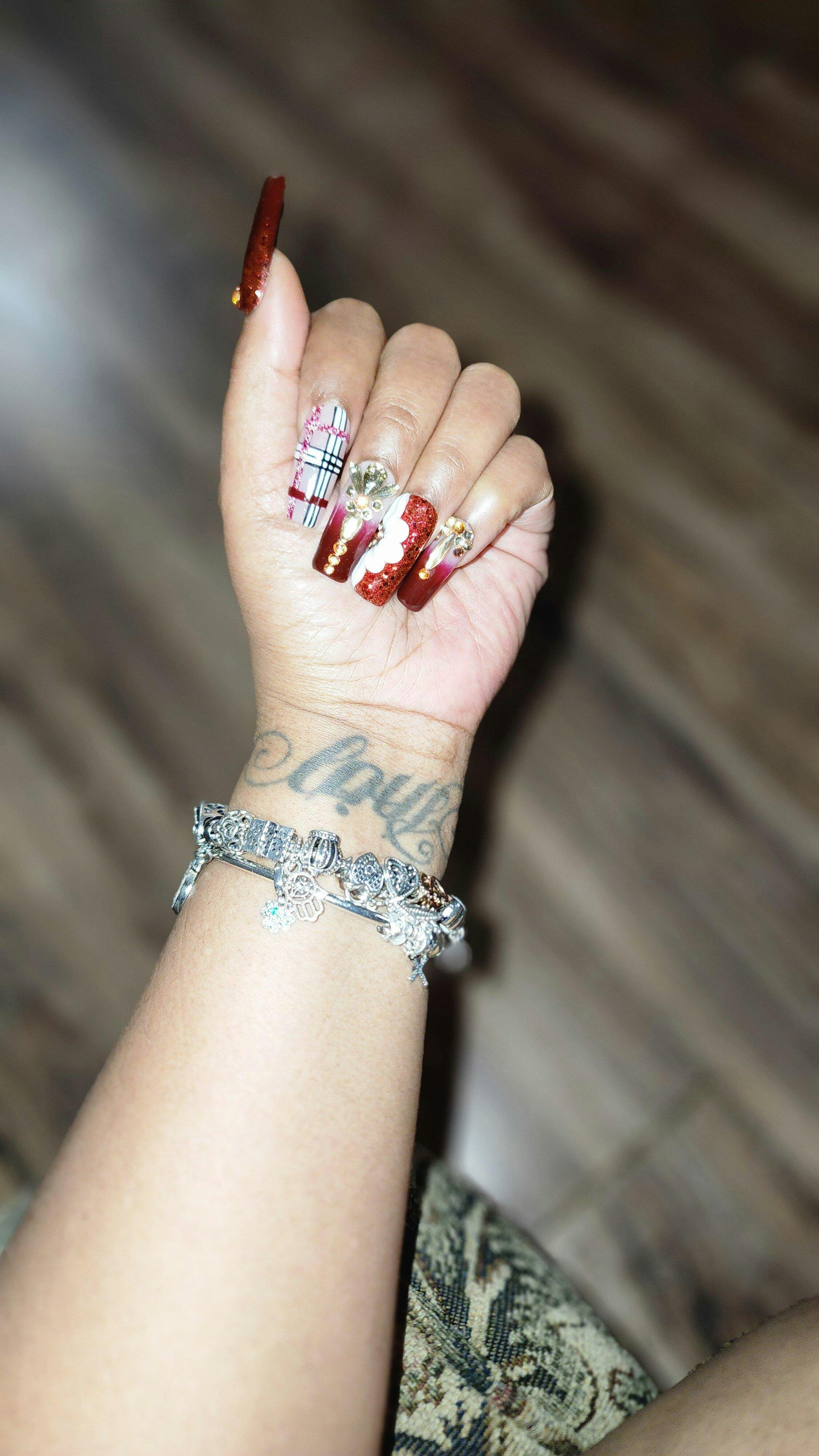 Crimson Charm nails bring a sense of timeless elegance, with deep red tones that exude warmth and sophistication. The rich crimson base is beautifully complemented by delicate white petals, adding a soft, graceful touch that feels both feminine and refined. The plaid patterns introduce a subtle nod to classic style, creating a balanced, yet bold statement. Tiny red glitter adds a hint of sparkle, catching the light in just the right way, while rose gold diamonds complete the look with a luxurious gleam. This design, crafted to perfection with salon-quality details, captures the essence of soft sophistication, making it the ideal choice for those seeking to combine elegance with understated glamour. Perfect for any occasion, Crimson Charm delivers a look that is both graceful and grand.