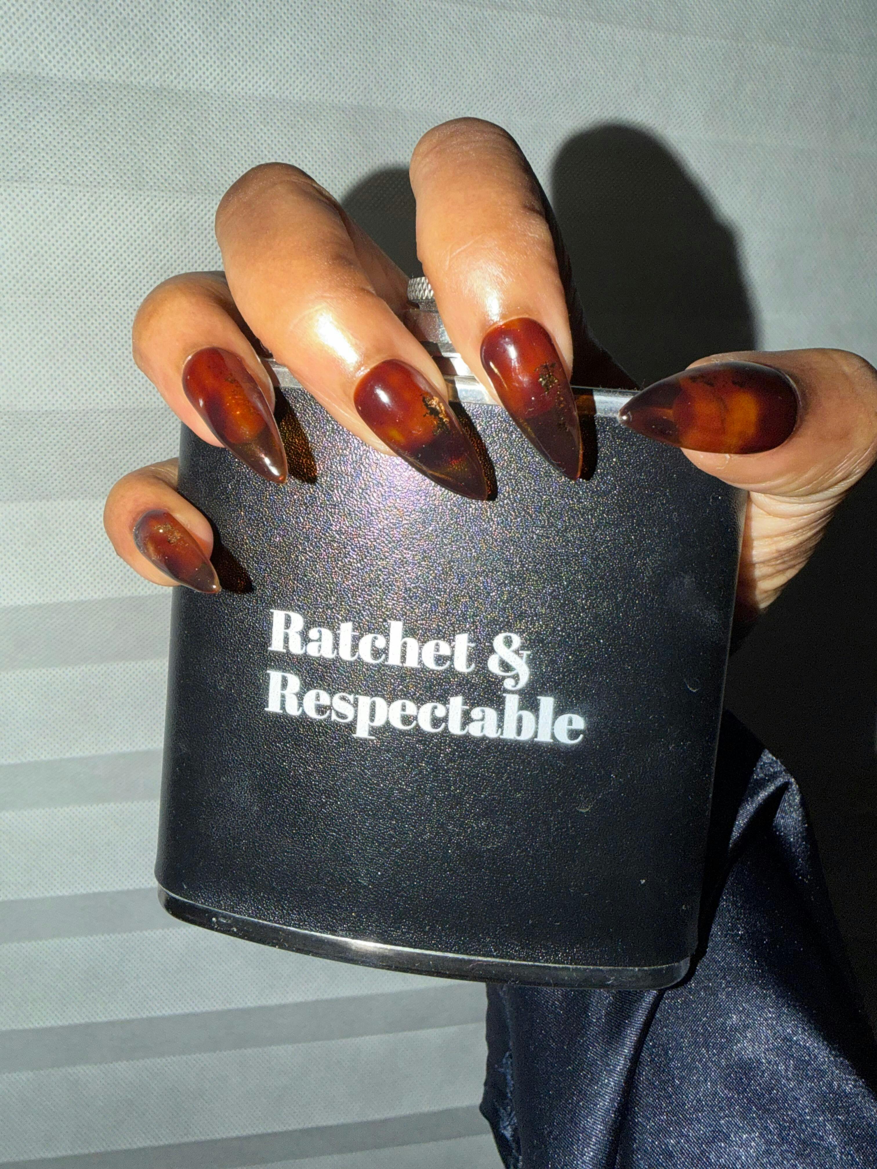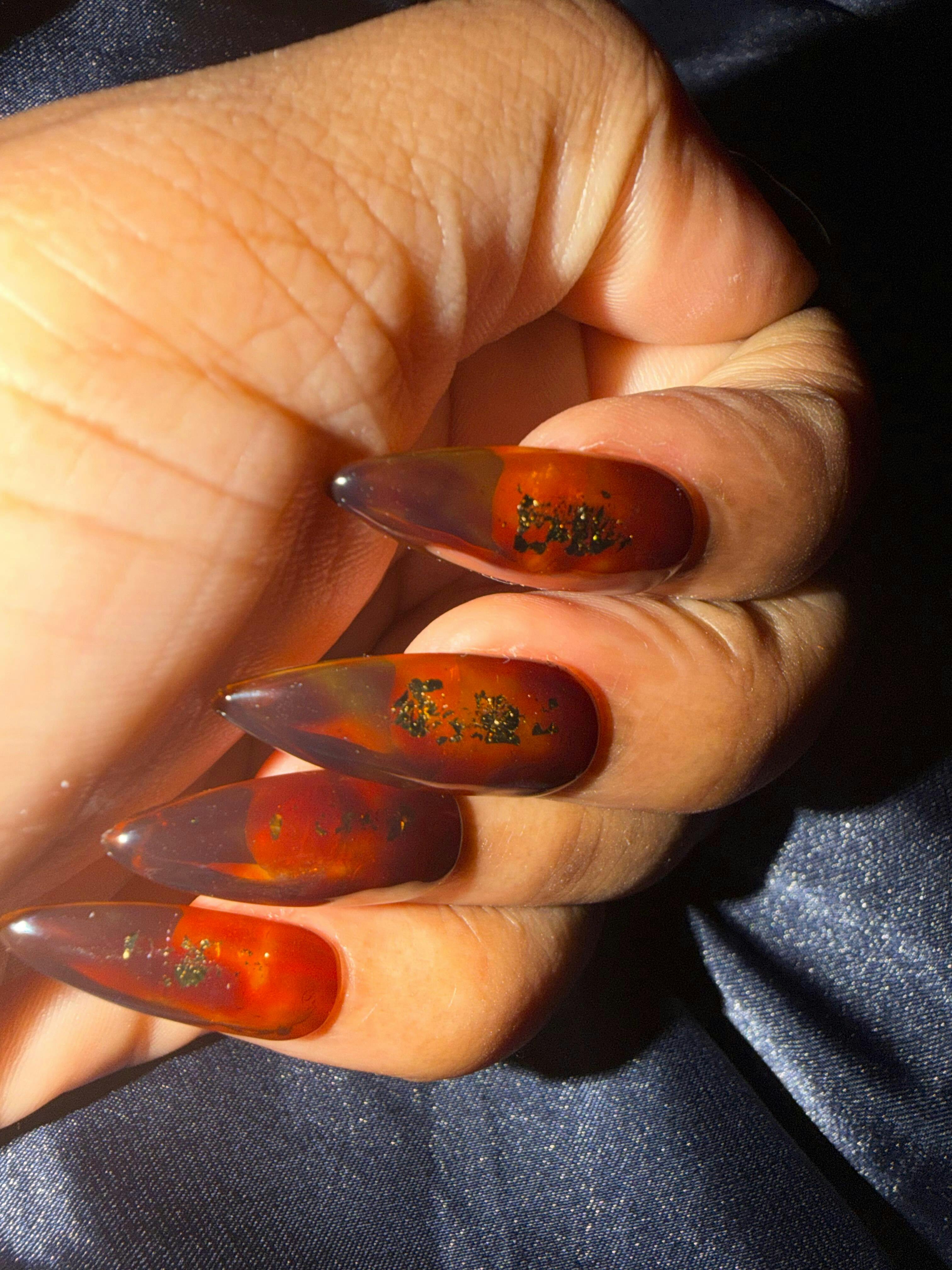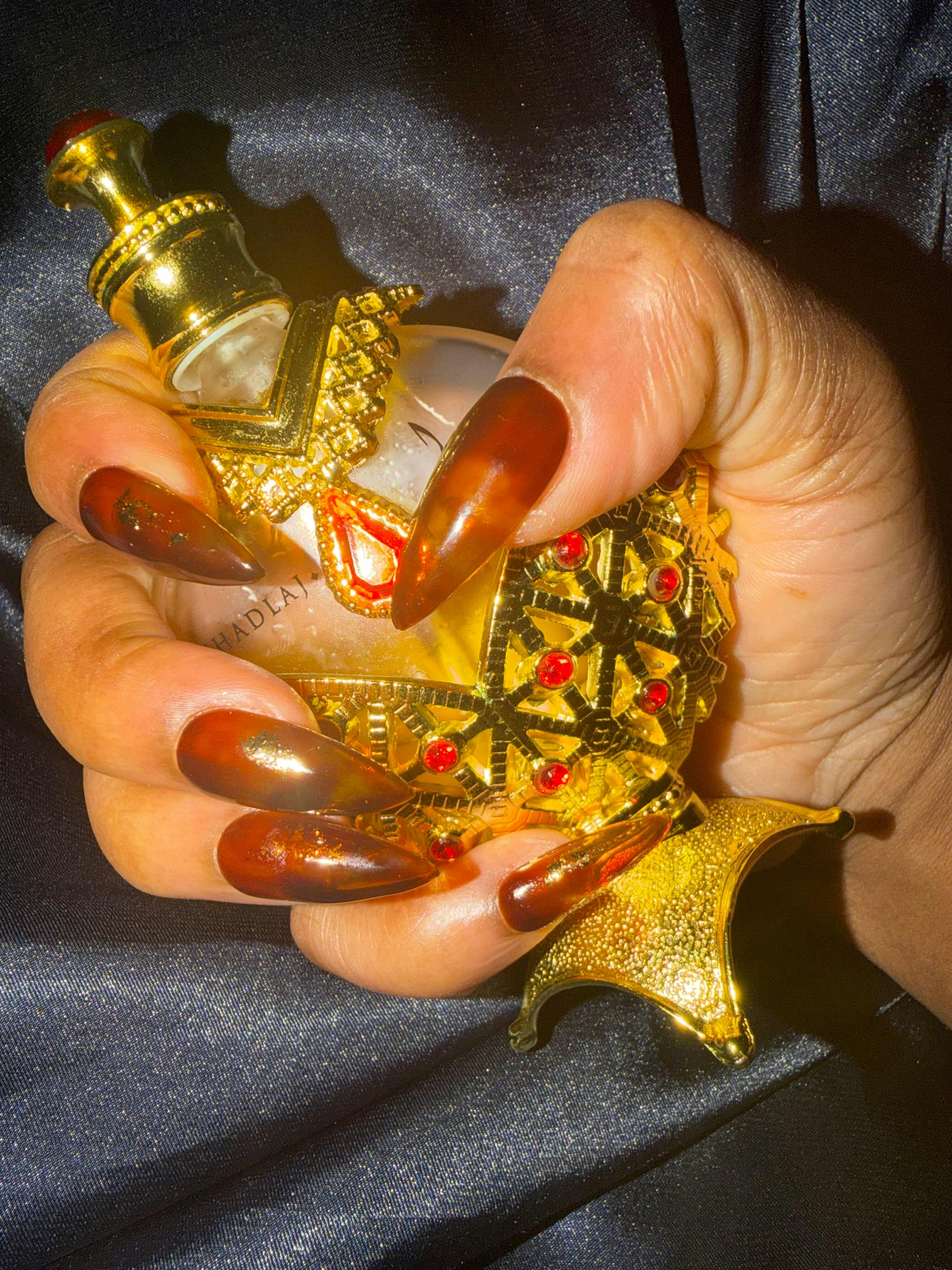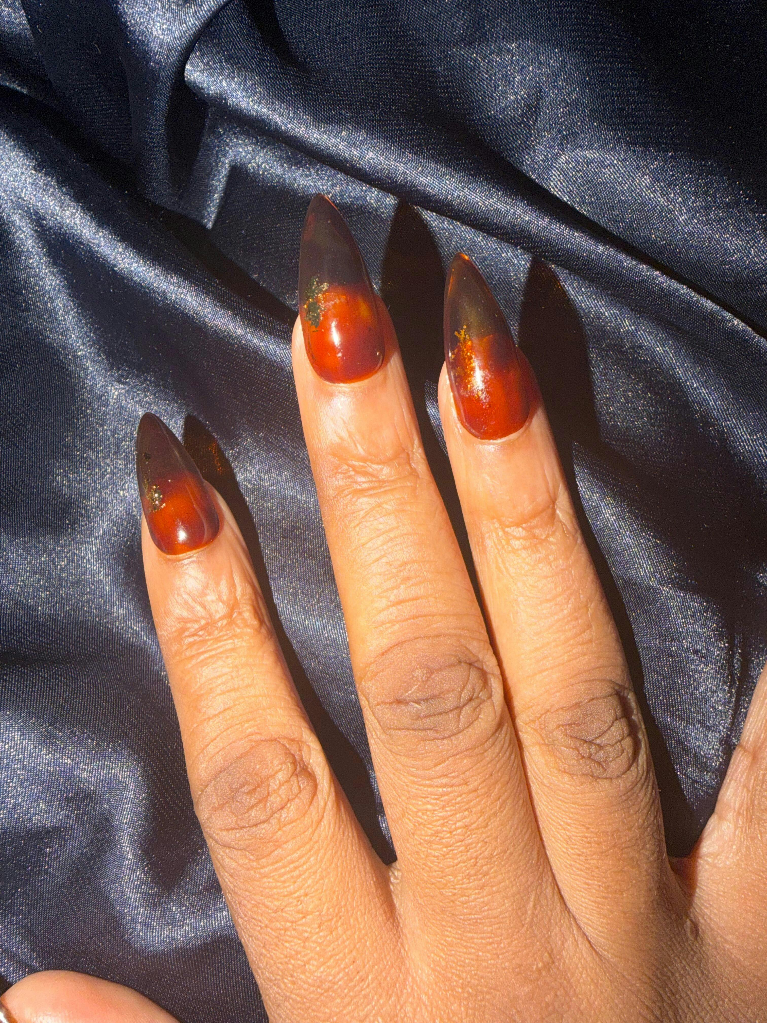 Mysterious and decadent, Dark Cognac Gleam evokes the rich glow of aged cognac under golden candlelight. A mesmerizing blend of deep amber hues and subtle flecks of gold captures pure luxury in every detail. These translucent, jewel-toned nails are perfect for elegant evenings and lovers of understated opulence.