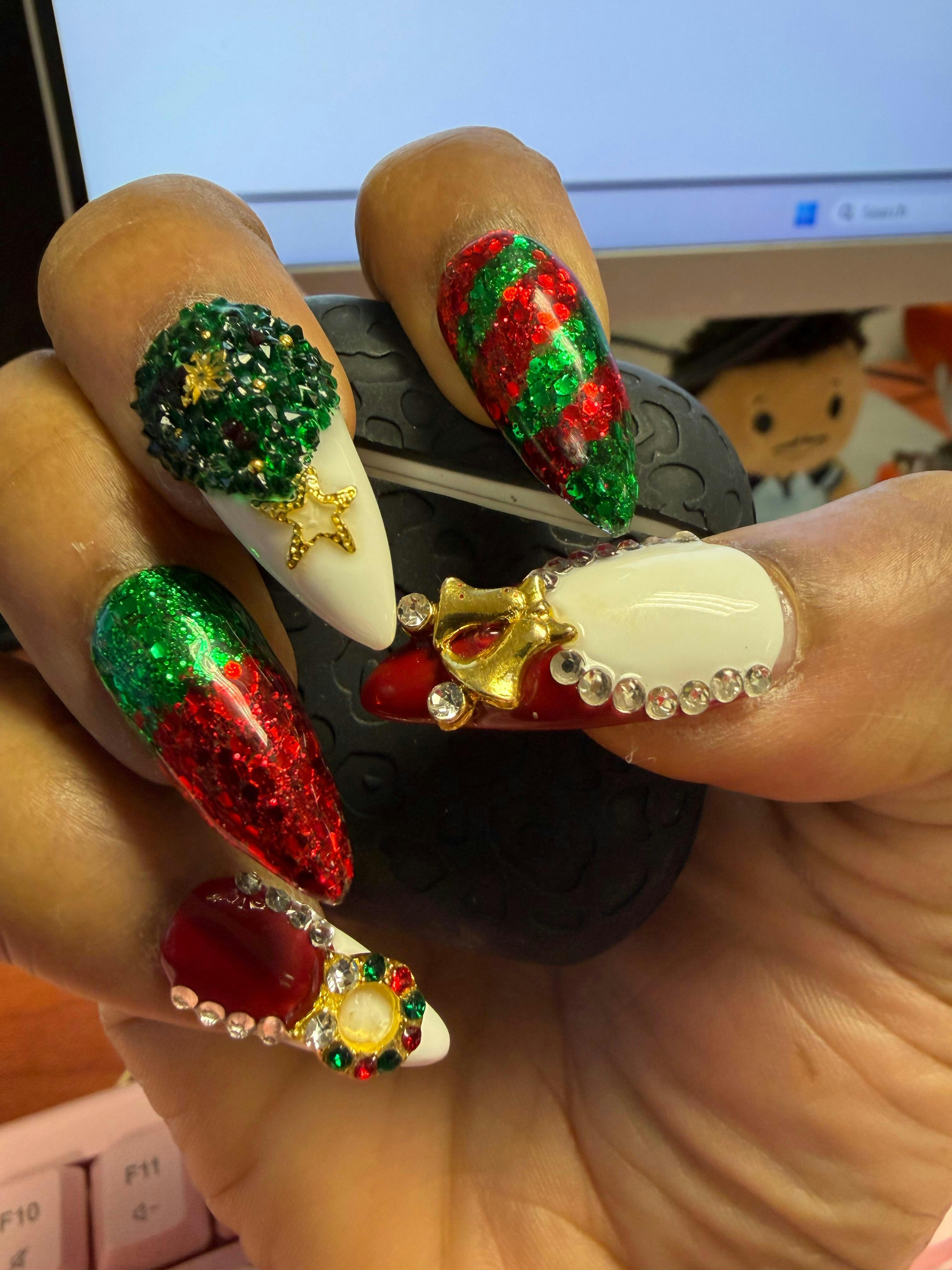 Ho! Ho! Ho! Celebrate this Merry Christmas with H78, featuring festive bell decorations and garnet designs. Each nail is handmade with delicate sugar crystals shaped like a Christmas pine tree, adorned with carefully placed snowflake decorations. Embrace the spirit of the season with joyful red and green colors, and add a touch of holiday magic to your fingertips!