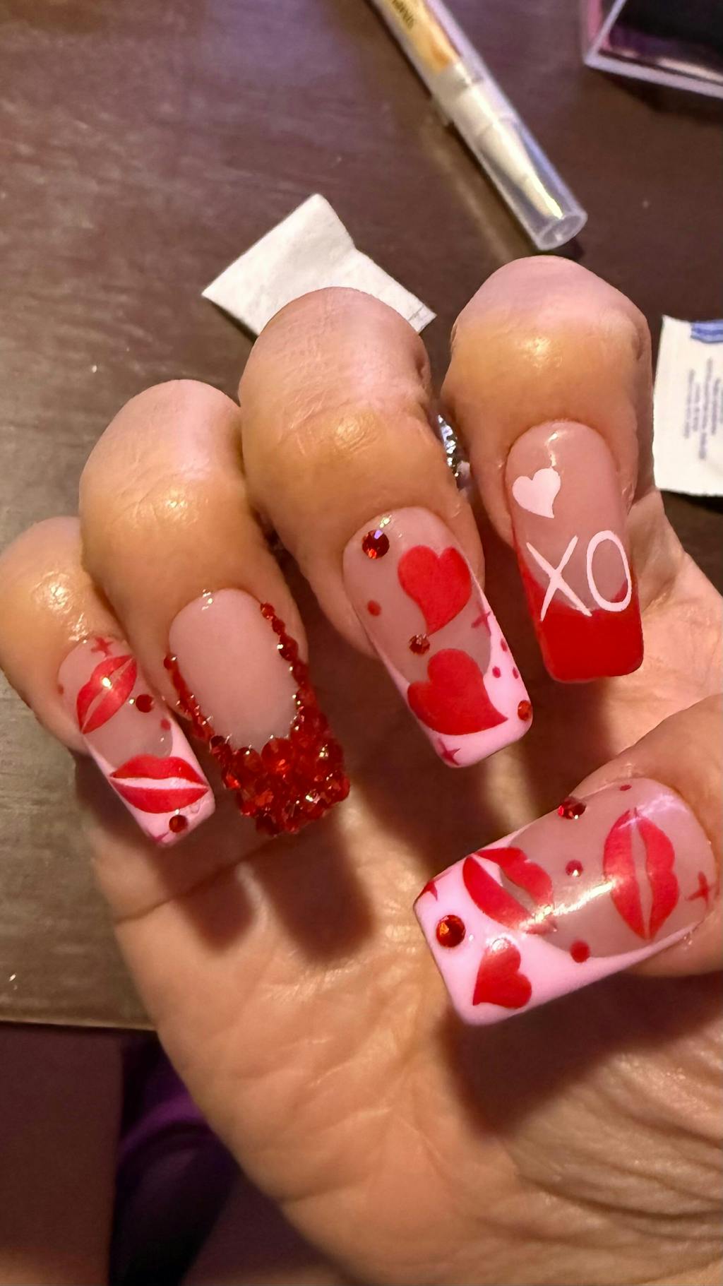 Sweet with a dangerous edge. Love Bite blends soft blush pinks with bold kiss prints, heart accents, and fiery red crystals for a look that's playful, flirty, and irresistibly daring. The glossy finish and statement details create the perfect balance between innocent romance and bold Y2K attitude.