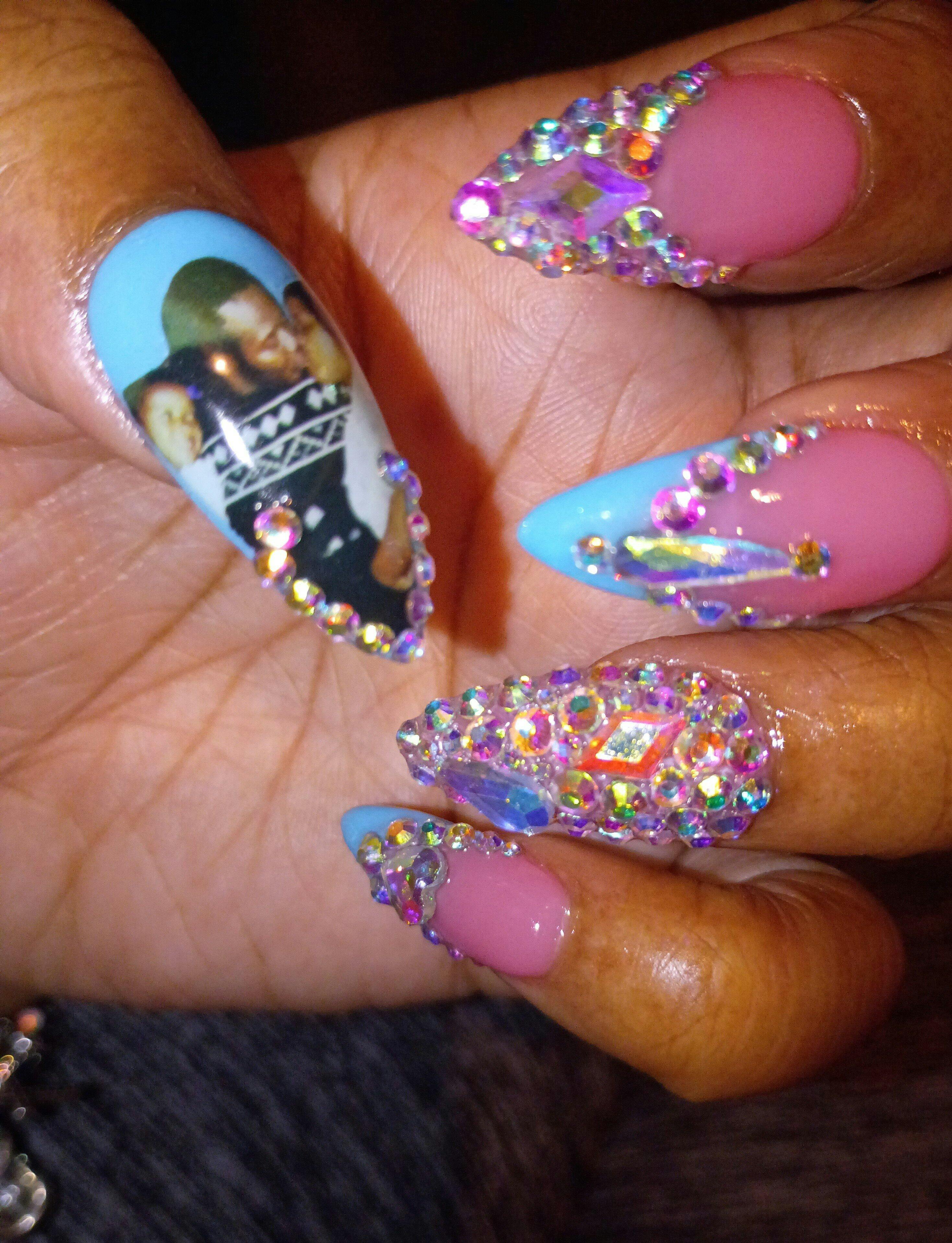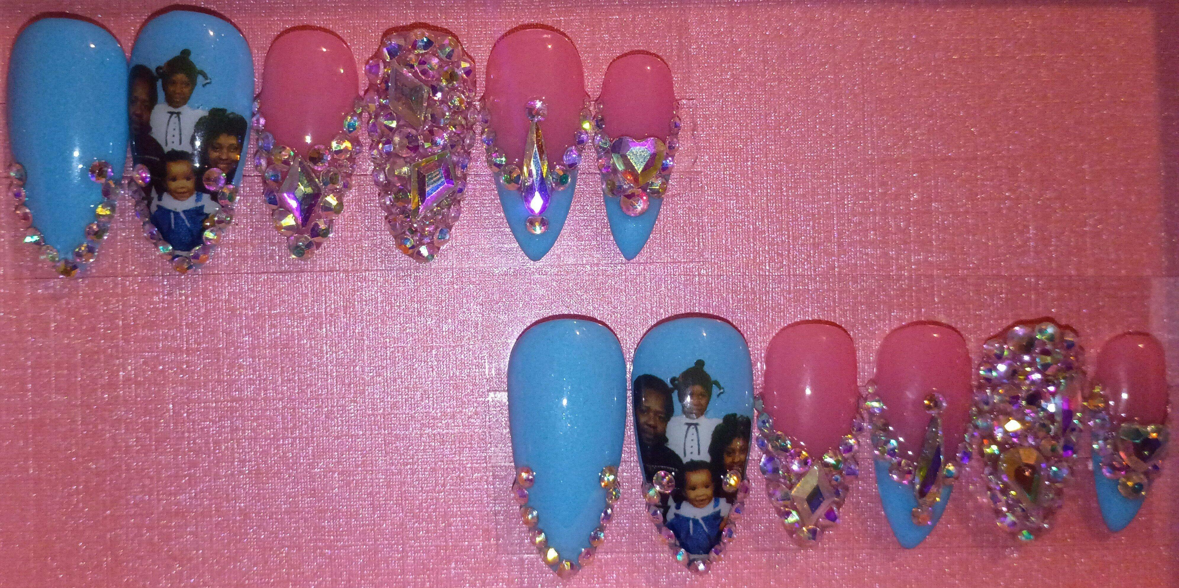 This exquisite set is fit for a queen! These acrylic nails feature a soft baby blue color with rhinestone embellishments. The heart on the nails is a reminder to love yourself. This set was made for you to be the center of attention like the diva you are. Be Fierce, Be Bold and Be Proud!|