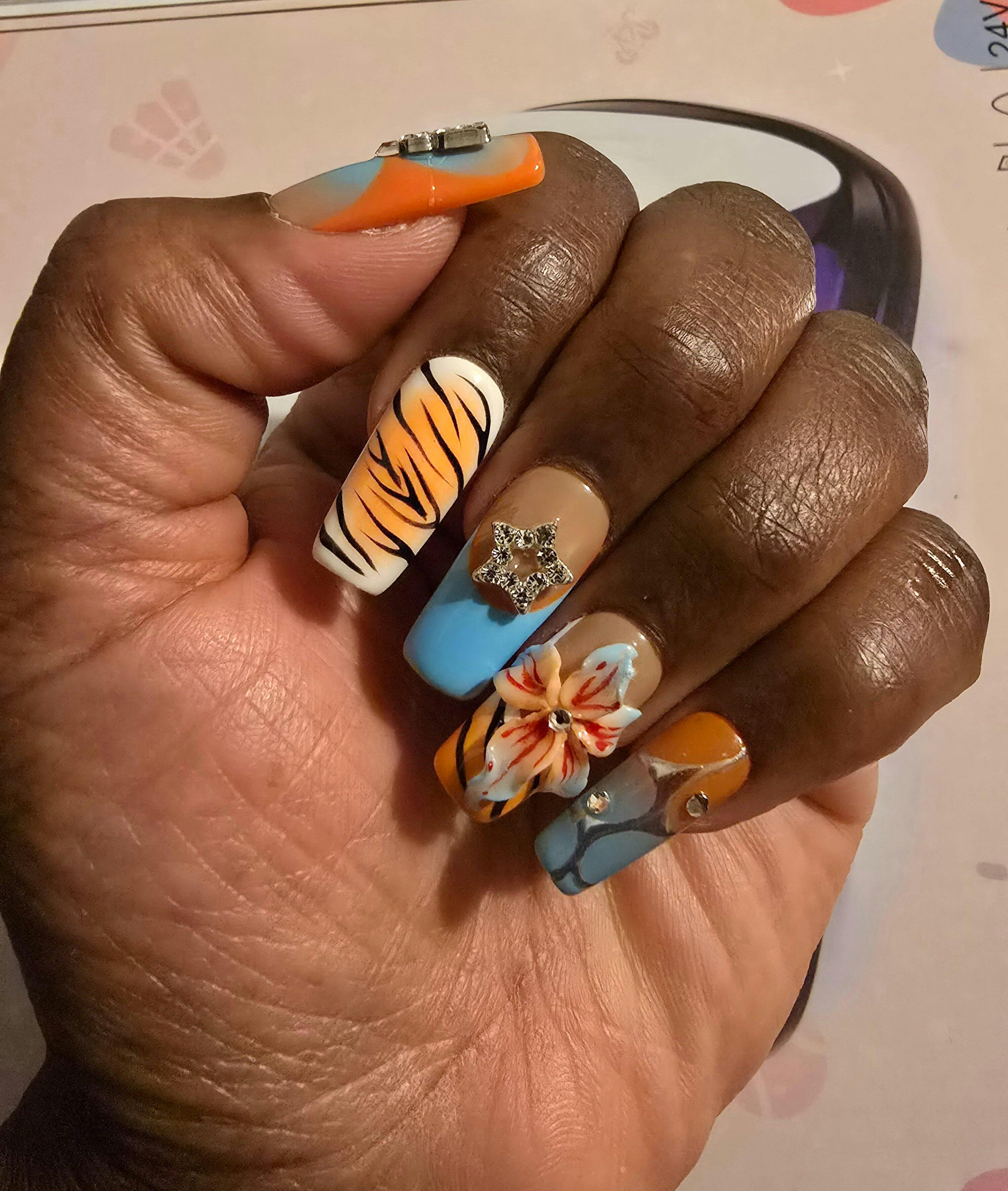 Feeling dangerous? Sunburn Safari brings the heat with fierce tiger stripes, a fiery blue-to-orange ombré, and tropical flower drama. It’s part wild animal, part ocean babe , made for the kind of girl who shows up loud, bold, and already glowing. Warning: these nails may cause spontaneous flirting and sudden bursts of confidence.